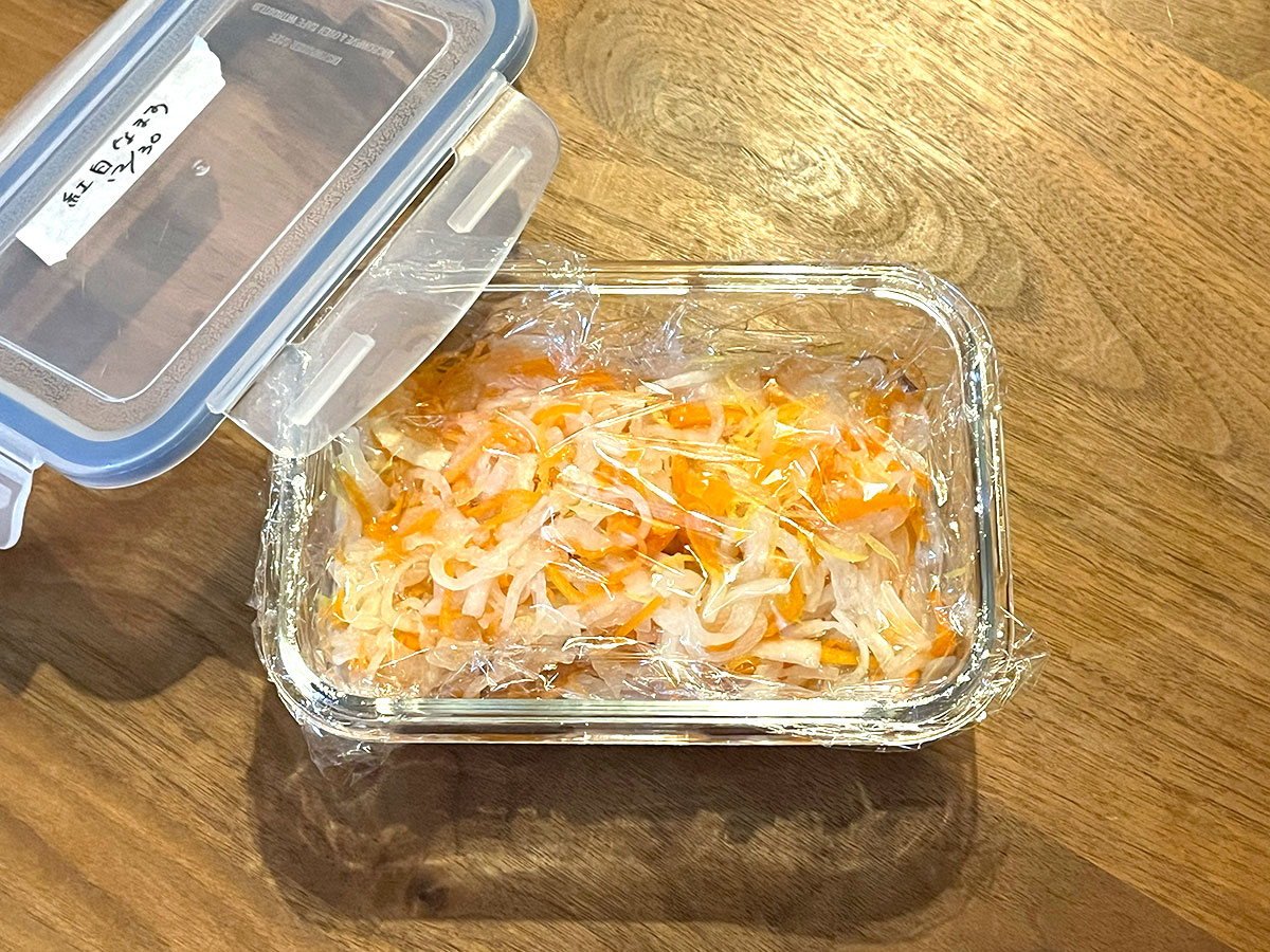 年末につくった紅白なますでうまく行ったアイラップでの水分しぼりを、ここでも流用しました。